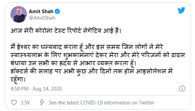 नई दिल्ली, एजेंसियां। केंद्रीय गृह मंत्री अमित शाह ने कोरोना संक्रमण के खिलाफ जंग जीत ली है। उन्होंने खुद इसकी जानकारी ट्वीट करके दी। उन्होंने ट्वीट कर कहा, ‘आज मेरी कोरोना टेस्ट रिपोर्ट नेगेटिव आई है। मैं ईश्वर का धन्यवाद करता हूं और इस समय जिन लोगों ने मेरे स्वास्थ्यलाभ के लिए शुभकामनाएं देकर मेरा और मेरे परिजनों को ढाढस बंधाया उन सभी का ह्रदय से आभार व्यक्त करता हूं। डॉक्टर्स की सलाह पर अभी कुछ और दिनों तक होम आइसोलेशन में रहूंगा।’