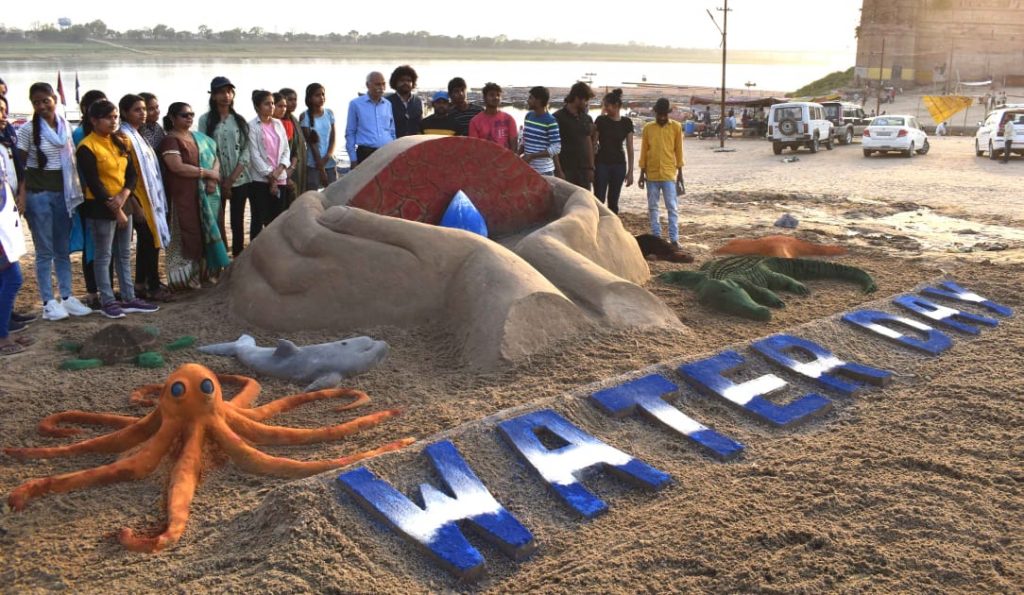 विश्व जल दिवस पर संगम किनारे बालू में जल संरक्षण का महत्व की आकृति बना कर दिया संदेश