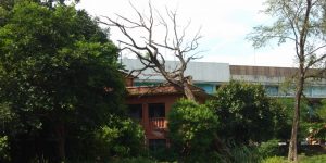 रेलवे कर्मचारियों के आवासों के दीवाल पर टिके है गिरे हुए सूखे पेड़