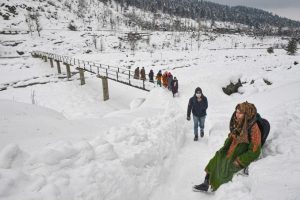 बारामूला जिले के तंगमार्ग के एक गांव में हाल ही में हुई बर्फबारी के बाद बर्फ से ढकी सड़क पर चलते बच्चे। ( छाया अनुराग शुक्ला )
