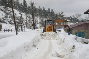 बारामूला जिले के तंगमर्ग गांव में हाल ही में हुई बर्फबारी के बाद एक अर्थमूवर ने सड़क से बर्फ हटाई। ( छाया अनुराग शुक्ला )