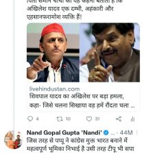 चाचा – भतीजे की लड़ाई पर चुटकी लेते हुए मंत्री नन्दी ने किया ट्वीट