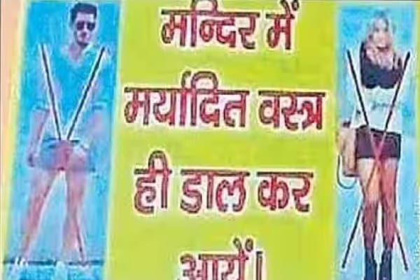 Dress Code In Mathura Temple: मथुरा के मंदिर में जारी हुआ ड्रेस कोड मथुरा ( अनुराग दर्शन समाचार ) । मथुरा के वृंदावन के सप्त देवालयों में शामिल ठाकुर राधा दामोदर मंदिर में अमर्यादित (छोटे कपड़े) वस्त्र पहनकर दर्शन करने आने वालों पर रोक लगा दी गई है। मंदिर के गेट पर पुरुष और महिलाओं से6 ऐसे वस्त्र न पहनकर आने की अपील का बोर्ड लगा दिया है।